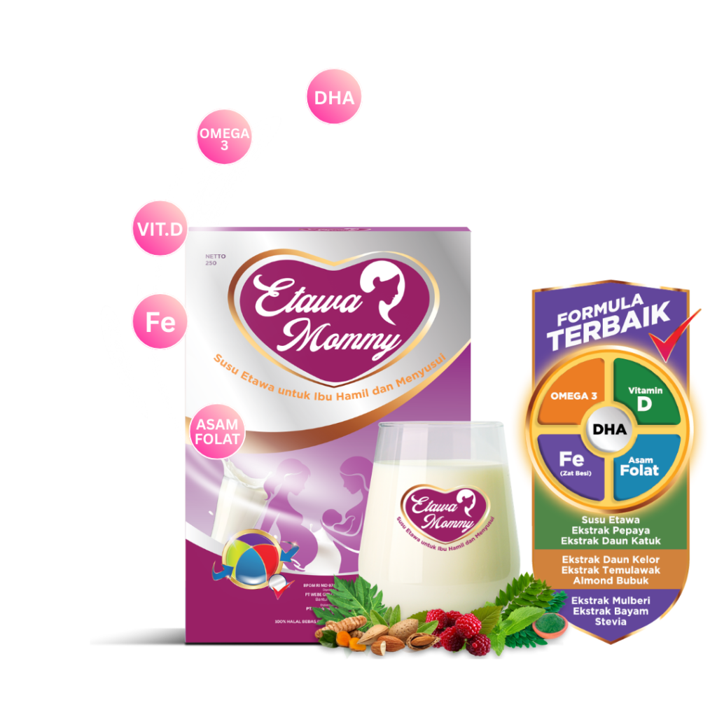 Etawa Mommy adalah susu rendah lemak yang diformulasikan khusus dengan Omega 3, Asam Folat, dan Zat Besi untuk mencegah anemia. Diperkaya ekstrak Daun Katuk, Almond, dan Temulawak, susu ini tidak hanya melancarkan ASI tetapi juga mendukung pembentukan saraf dan otak janin agar bayi lahir cerdas. Menggunakan pemanis alami Stevia, sehingga aman menjaga berat badan Ibu tetap ideal selama masa produktif.